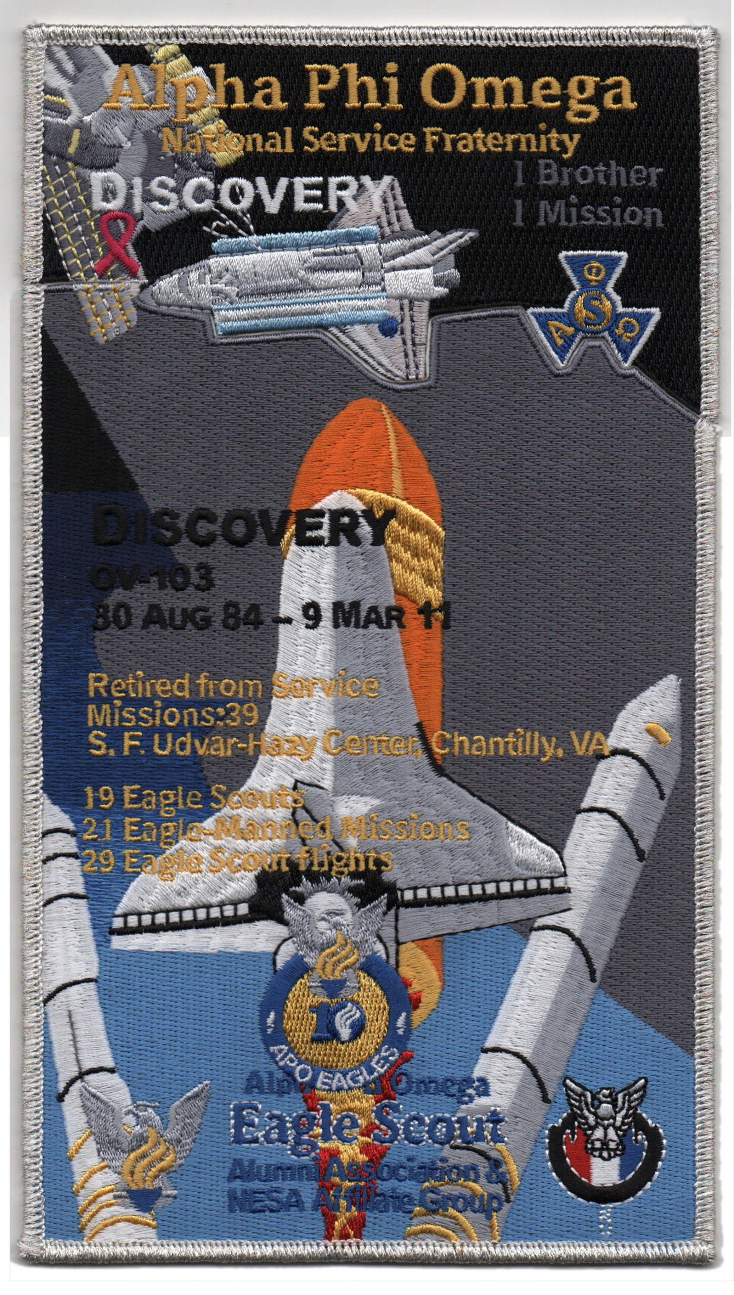 This is a patch set of space shuttle and commemorates the Discovery Space Shuttle. The patch has been made for the 10th Anniversary of the APOEagles Alumni Group.